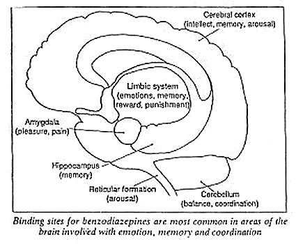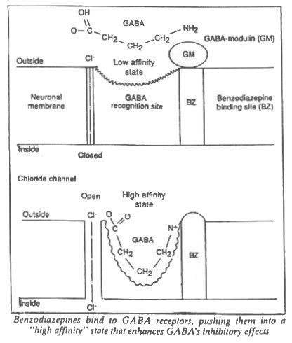 Many of the actions of benzodiazepines probably result from such an enhancement of GABA's inhibitory powers. The drugs relax muscles because they inhibit some areas of the brain that control muscle tone. The anticonvulsant effects are due to the inhibition of the spread of electrical activity in the brain. The ability of benzodiazepines to induce sleep and tranquillity may also stem in part from the secondary damping of the release of other neurotransmitters, such as noradrenaline and serotonin, in excitatory pathways influencing arousal and emotional responses. Some researchers have even suggested that anxiety states may be the result of the underactivity of GABA in the brain. The neurotransmitters may fail in their suppressive activities because too many GABA-receptors remain in the low affinity state, or fail to show the normal protective increase in affinity for GABA under stress. Benzodiazepines would promptly reverse such a situation. It is interesting that barbiturates, other sleeping pills, alcohol and some antiepileptic drugs also enhance or mimic the activity of GABA in the brain. These drugs have similarities with benzodiazepines in that they induce sleep, reduce anxiety and convulsions as well as being liable to cause drug dependence.