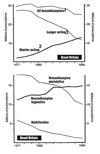 These latest statistics raise queries about the extent to which any reduction in dependence problems associated with the drop in benzodiazepine prescribing may have been counteracted by increasing use of shorter acting compounds. They also suggest that attempts to achieve further major reductions in prescribing will have to tackle the less dramatic but now more widespread use of benzodiazepines as hypnotics. One seemingly unqualified bright spot in recent prescribing trends is the continuing drop in the prescribing of the overdose-prone barbiturates, down to just 1.3 million prescriptions in 1986.