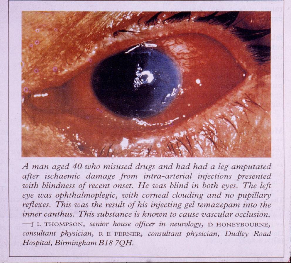 Click for larger imageA complication of temazepam injection. A man aged 40 who misused drugs and had had a leg amputated after ischaemic damage from intra-arterial injections presented with blindness of recent onset. He was blind in both eyes. The left eye was ophthalmoplegic, with corneal clouding and no pupillary reflexes. This was the result of his injecting gel temazepam into the inner canthus. This substance is known to cause vascular occlusion (with permission from Thompson et al. 1993).