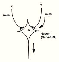 Neuron A is involved in salivation. There are two neural pathways (axons) X and Y converging on the neuron A. X is a strong pathway from the olfactory system that responds to the smell of food and always activates the neuron A. Y is a weaker pathway from the auditory system that responds to the sound of a bell but rarely activates neuron A. If X and Y are activated together the activation of A by X sends a retrograde signal to Y which strengthens the synaptic connection between A and Y. The neuron A will have learned to become responsive to Y as well as X and Y will have learned how to activate A more efficiently. So that an association between X and Y and been 'learned' by neuron A and the sound of a bell would produce salivation.